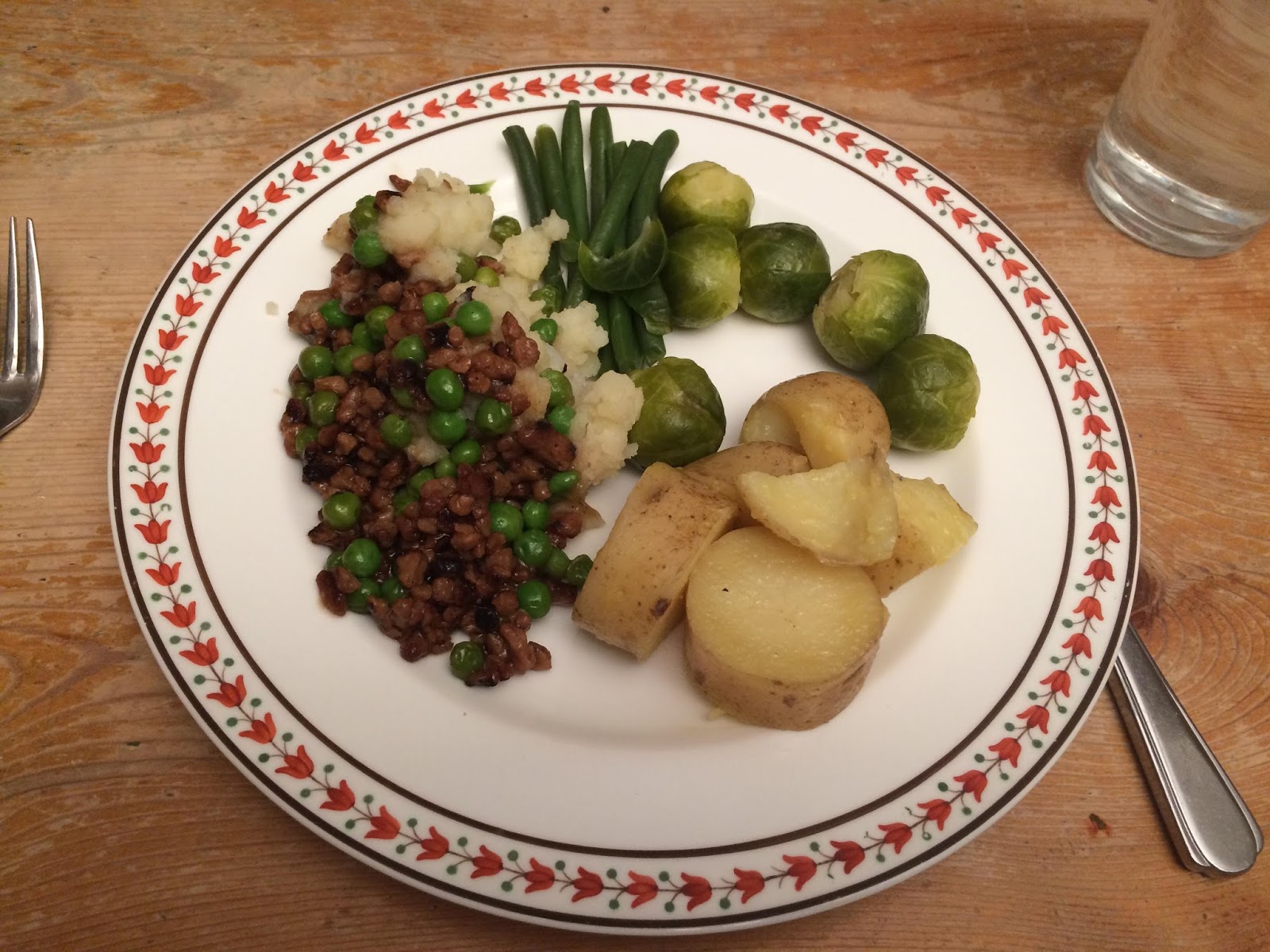For dinner I was lucky enough to come home to a vegan shepherds pie made by my Dad. I believe he used Tesco's fake mince, gravy, then added peas and mashed potato on top. Alongside this we had green beans, sprouts and potatoes, so a typical British dinner!