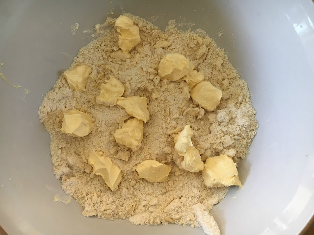 - Break the butter into small chunks and dot around the mixture (see picture), along with the vanilla extract, then mix in with your finger tips until the mixture resembles breadcrumbs, continue mixing until it forms a dough.*