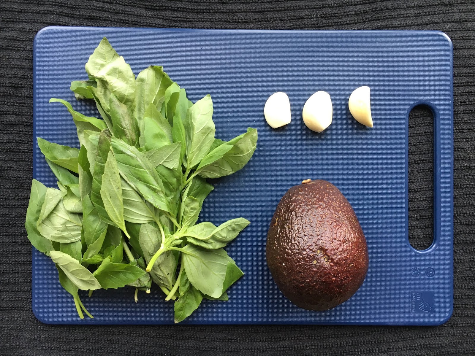 - Put the avocado, basil, garlic, lemon juice and olive oil together in a blender and pulse until a smooth mixture is formed.
